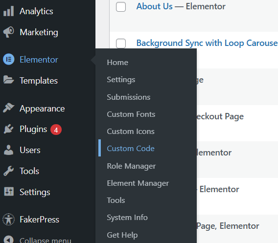 - Hover on Elementor and click on “Custom Code” as shown below: