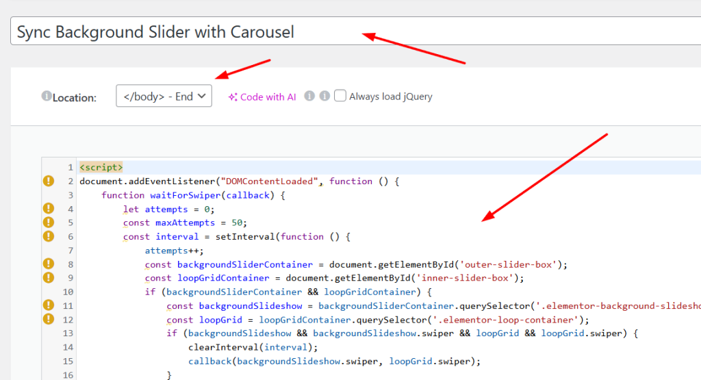 - You will be adding custom JavaScript code into your website via the Elementor Custom Code feature.